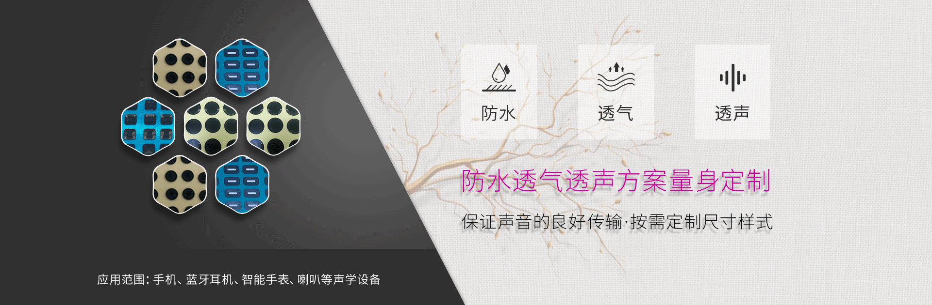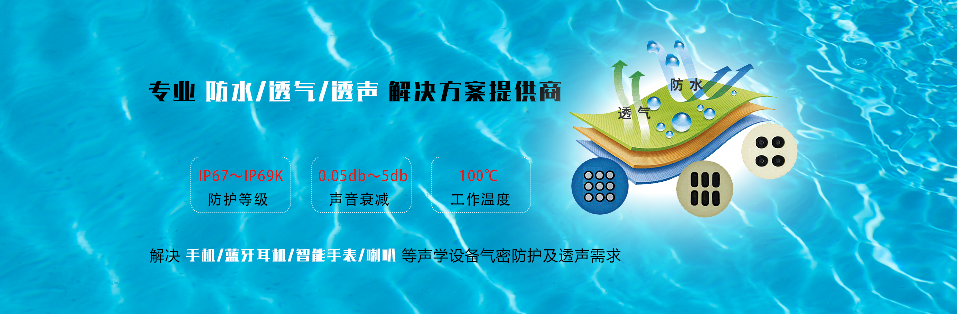 成立于2012年1月,我司自主研發(fā)生產(chǎn)及銷售:防水透聲膜,防水透氣膜,防水網(wǎng),產(chǎn)品能夠提供高達(dá)IP54- IP57- IP67 - IP68的防護(hù)等級(jí),在保證音質(zhì)的同時(shí),提供更好的防水-防塵-防油污性能,具有穩(wěn)定的透氣性,耐高溫,抗老化,適度的柔軟性....