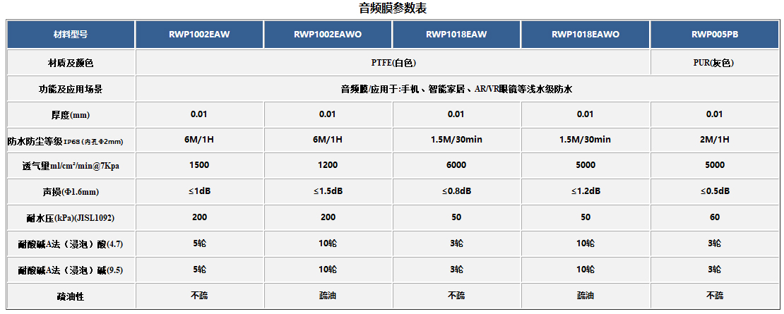 他們的音頻防水膜產品保持了出色的聲學一致性,內徑1.6mm的典型設計,聲音衰減和離散性較低。在100 Hz-10 kHz頻率范圍內,平均插入損耗低于0.5dB(1米30分鐘)或1.0dB(2米60分鐘)。